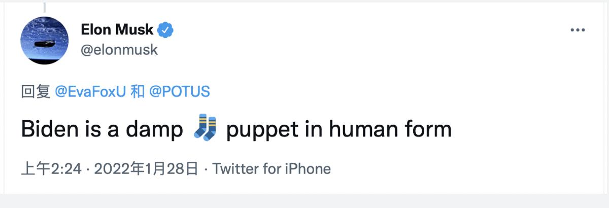 这引起了马斯克的不满,他曾多次发推文嘲笑讽刺拜登,比如“拜登把美国公众当成傻瓜”、“拜登是一个人形湿袜木玩偶”。