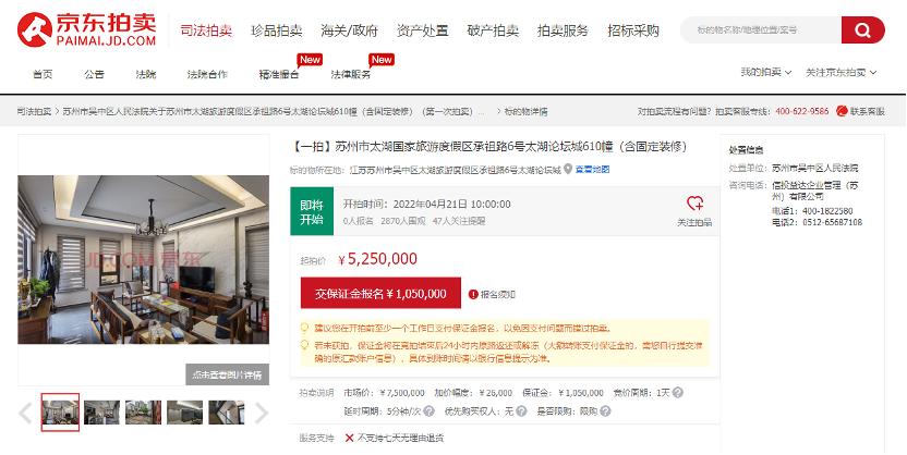 4月20日-4月22日,京东拍卖联合苏州市中级人民法院及辖属10家基层法院,推出“邂逅春天—京东首届苏州法拍节”,为竞买人提供了丰富、多元的优质标的,太湖国家旅游度假区别墅7折开拍,苹果、华为等品牌手机1元起拍,还有极具质感的红木家具、品种丰富的国产名酒。