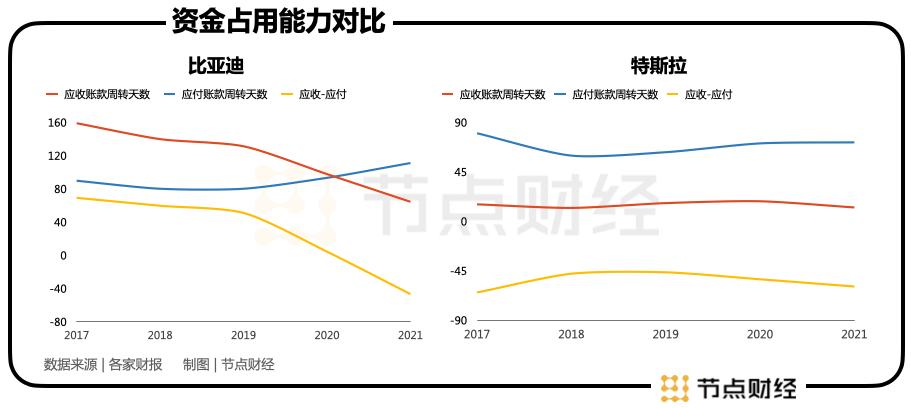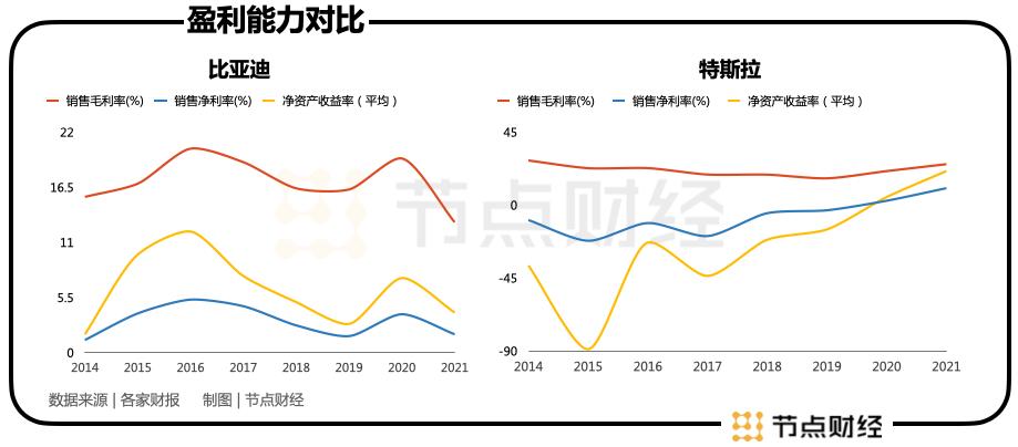 与特斯拉相比,比亚迪的盈利能力变化并不乐观。特斯拉的销售净利率在2019年前一直负增长,而这两年在环境不好的情况下实现了突围。反观比亚迪,销售净利率一直不温不火。净资产收益率则更为明显,特斯拉快速突围至20%,而比亚迪还在低位。
