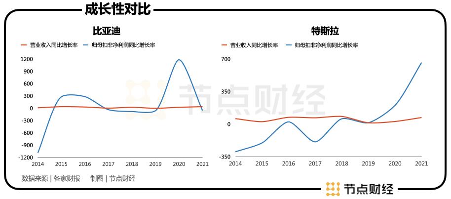 成长性对成长股来说至关重要。2017~2019的低迷,使得比亚迪的股价也在低位徘徊,2020年开始,一记漂亮的上升浪,比亚迪迎来了股价与业绩的戴维斯双击。与此同时,2019年前的特斯拉还一直在亏钱,2020年才开始盈利,47亿(RMB)的净利润未及60亿的比亚迪;然而21年画风突变,特斯拉以迅雷不及掩耳之势在增长,352亿的净利润已将40亿的比亚迪拉下一大截。