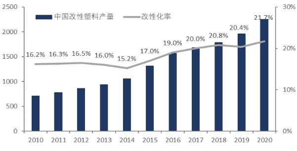 国内改性塑料行业产量也是呈现逐年递增的趋势,2010-2020年复合增长率约11%,改性化率由2010年的16.2%增长至2020年的21.7%。