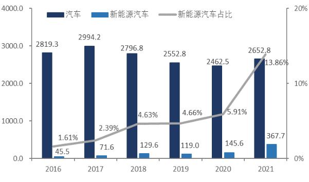 2016-2021年中国汽车产量,单位:万辆 数据来源:wind、36氪整理