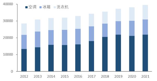 2012-2021年中国白色家电(空调+冰箱+洗衣机)产量,单位:万台 数据来源:wind、36氪整理