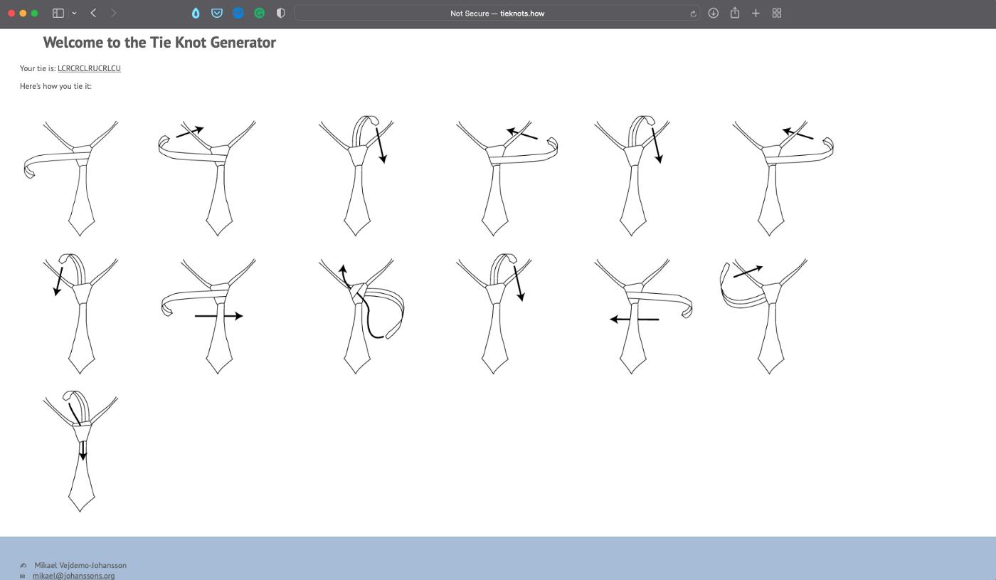 你可能会疑惑打领带和数学有什么关系,但有趣的是打领带真的和数学有关。瑞典数学家Mikael Vejdemo-Johansson研究了打领带有多少种不同的方式,他发现这个数字是177,147。然后他根据他的研究结果开发出了The Tie Knot Generator。如果你愿意,你可以一步一步地发现更多新的、与以往不同的打领带方法。