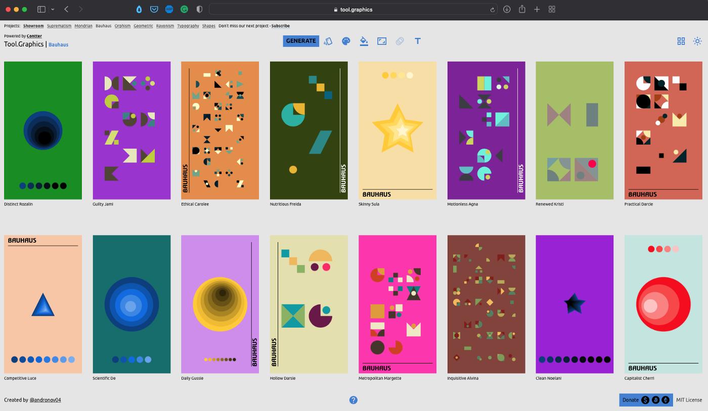 如果你问我互联网上最好的几何工具是什么,我一定会回答说是Bahaus Art Generator。它太棒了:你可以自行设置调色板、风格和尺寸,然后你就会看到展现出的几十种几何海报。你可以下载喜欢的海报,把它挂在墙上。