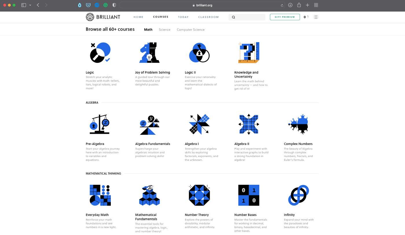 Brilliant.org是由两个硅谷工程师开发的网站,他们对数学和物理学等基本领域的研究已经到了登峰造极的程度。他们的风格非常与众不同,(我认为)他们的网站比所有其他用于教授数学的工具都要有效。他们的方法是让具有自驱力的人可以通过阅读主题和解决相关问题来学习,而无需观看视频课程。如果我们能像Brilliant那样教数学,我相信会解决掉很多教学上的难题。但这个工具只对那些数学基础良好的人适用,因为网站上的一些内容还是蛮有挑战的。