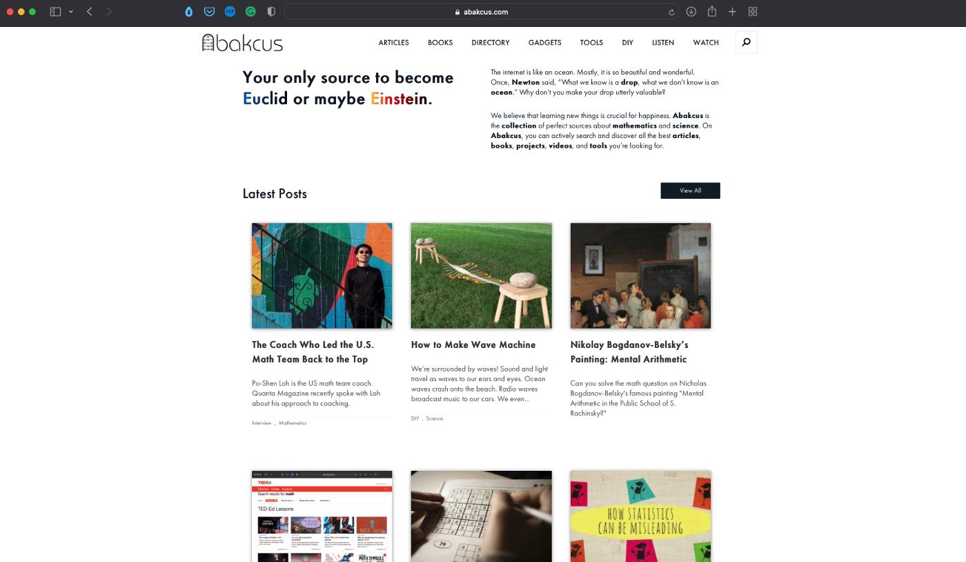 Abakcus是我从小就梦寐以求的一个网站,毫不夸张地说它承载了互联网上最好的数学内容,但很遗憾,过去两年里它一直勉强维持运营。在Abakcus上,你会发现很多关于数学和科学的高质量的学习内容。例如,你可以找到历年所有的为数学家发行的邮票,你可以找到几十个关于数学主题的阅读书单,你可以找到所有提出了令人惊叹的定理的优秀数学家的介绍……所有能够帮助你成为一个伟大的数学教师的工具都应有尽有。