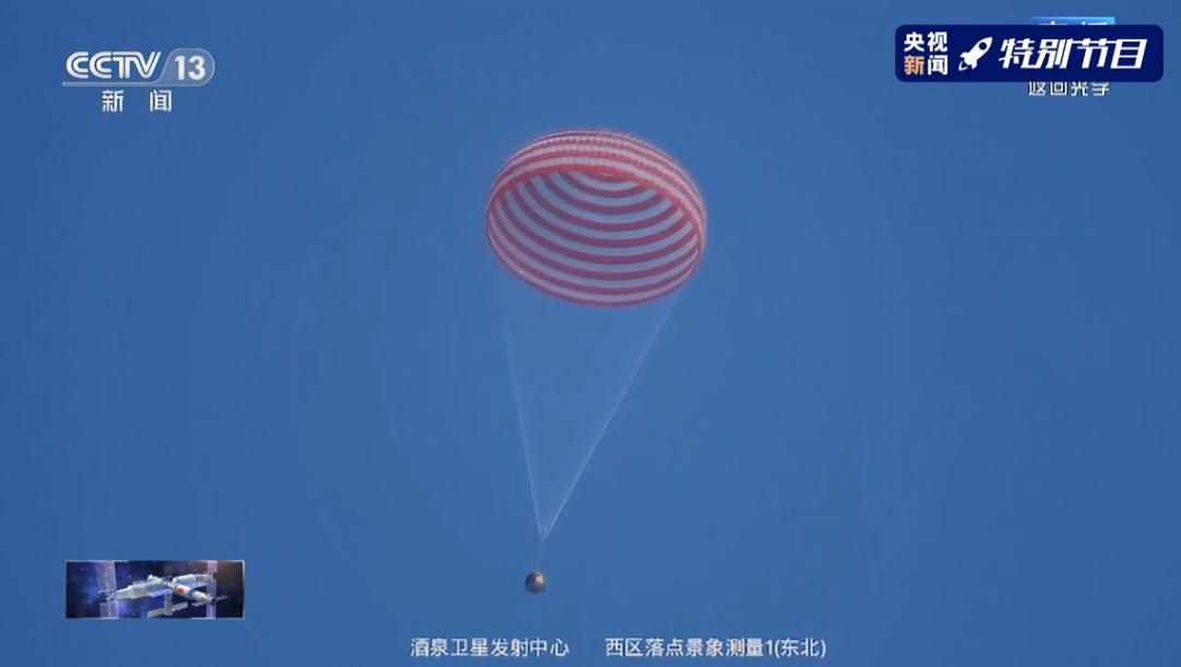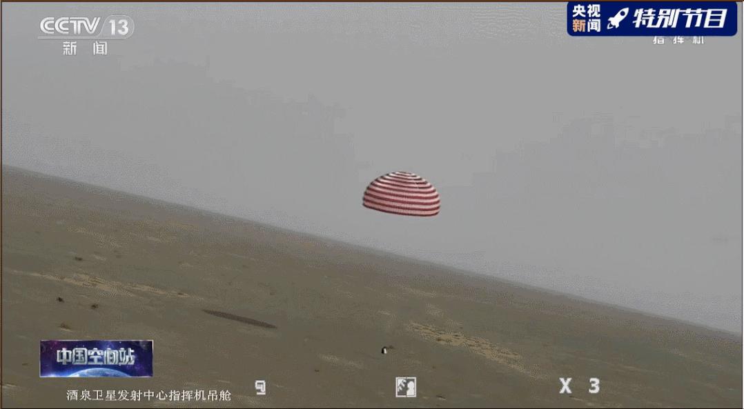 紧接着,9时40分左右,在神舟十三号返回舱距离地面10公里左右的高度,一个薄如蝉翼的1200平米的大降落伞打开,载着返回舱降落,这时画面也变成了地面端拍摄的彩色。