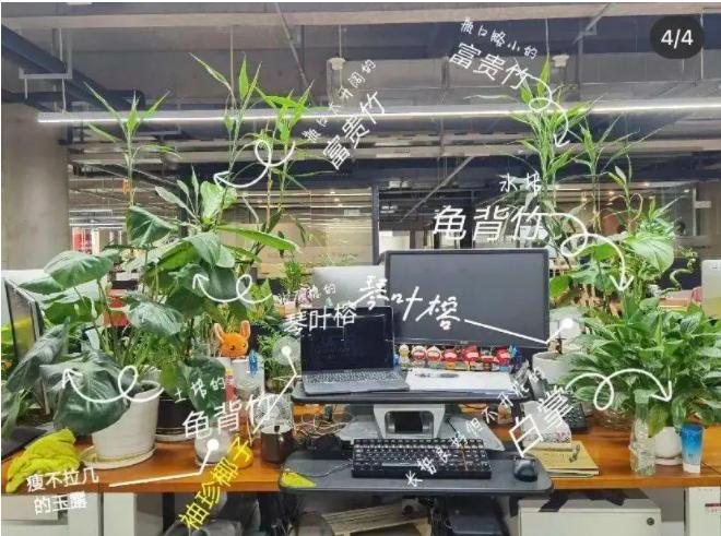 就像部分职场人,别看照顾不好自己,可工位上的花花草草却养的不错,茂密的盆栽不仅养眼,还可以当掩护,别人上班摸鱼,他上班浇水,有时候还不忘朝着财神的方向,再买8支富贵竹点缀,就为了图个吉利。