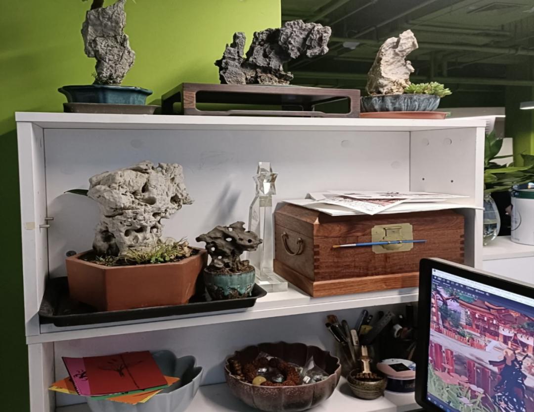 更有趣的是,对风水深信不疑的职场人,在更换工位后,直接将不同的假山排列在书柜上,用他的话来说就是,新工位要换换新风水。
