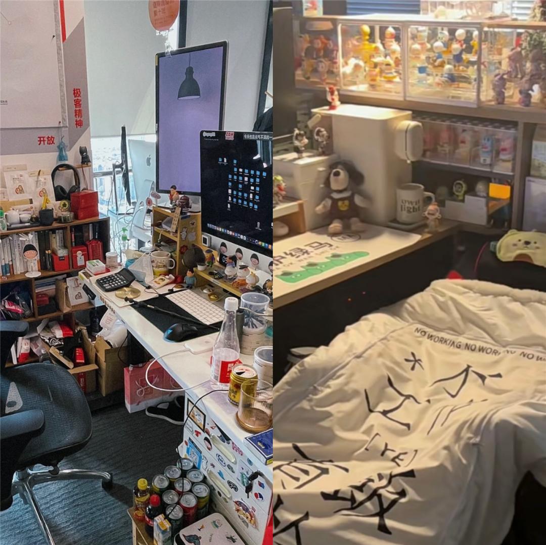 折叠床、毛毯、拖鞋、宠物,只要是日常生活用到的,公司一定会有,时不时改变工位布局、更换新的装饰品已经成为日常生活中的一部分。