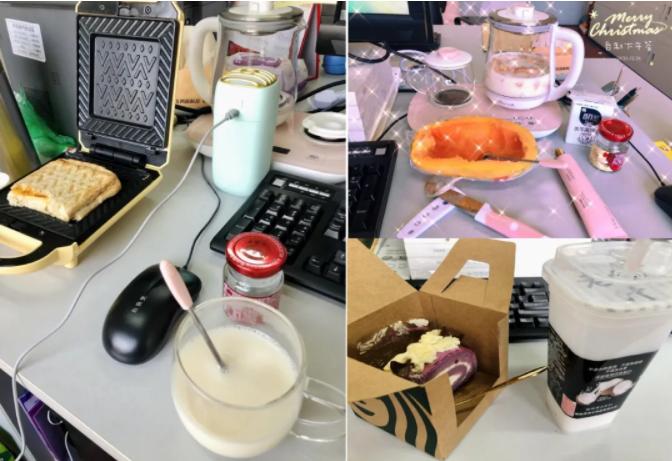 加湿器、养生壶不算稀罕,有人还往工位里放加热饭盒,准备了电炖锅,上班间隙煮火锅和螺蛳粉,不知道是种什么体验。