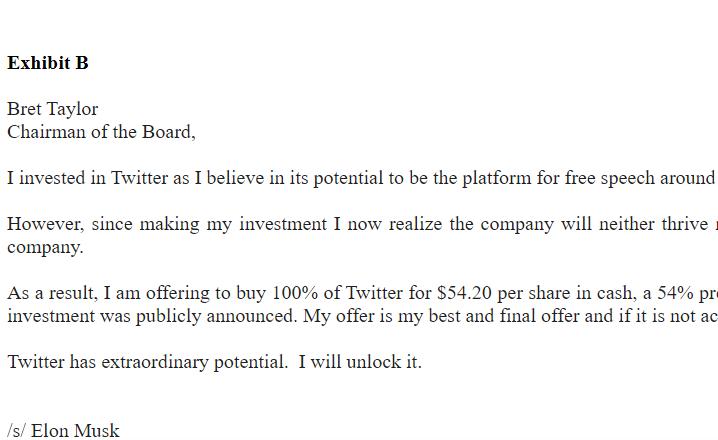 在4月14日马斯克提交给SEC的材料中,他还附上了一封写给推特独立董事长、Salesforce联席CEO泰勒(Bret Tylor)的收购邀约信。这封信非常简短,但信息量却极大。