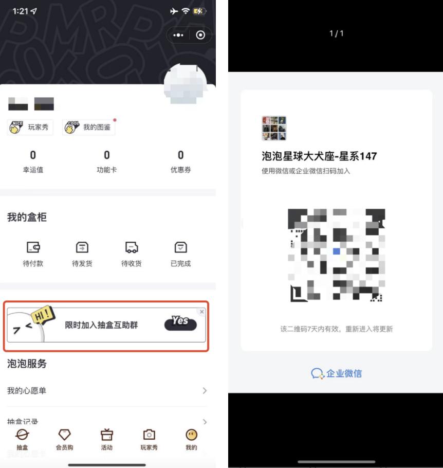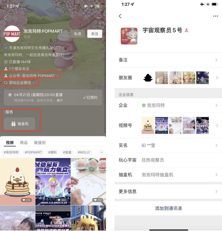 小程序:泡泡玛特有「泡泡玛特」、「泡泡玛特抽盒机」两个主要的小程序。小程序除了线上购买的功能,还承载了重要的私域引流入口。具体路径: