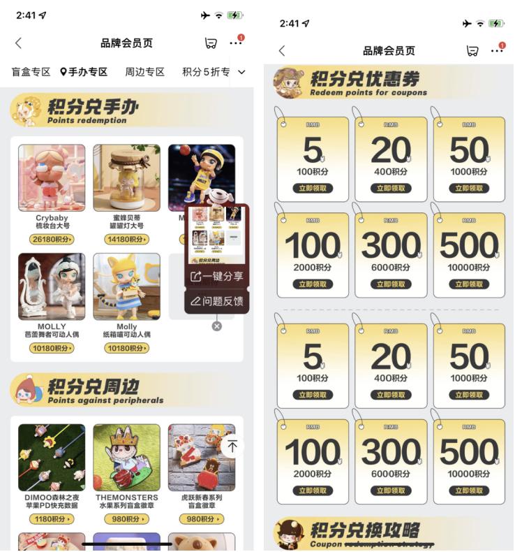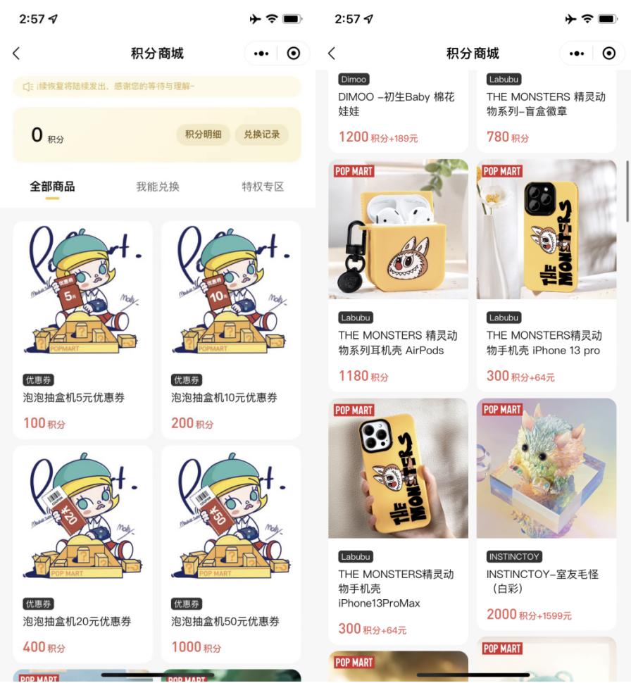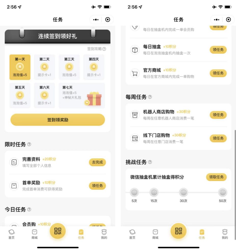 目前泡泡玛特在微信小程序和电商平台中有会员的体系,小程序中包含成长型会员和付费会员,京东和天猫上只有简单的成长型会员,两者都拥有积分的体系。