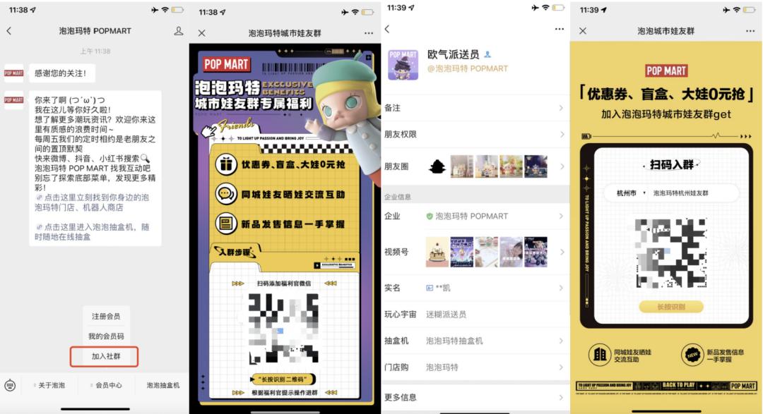 线下门店: 在泡泡玛特门店的收银台前,都会有入群的二维码台卡引导,包括店员也会通过福利引导客户加微信入群。