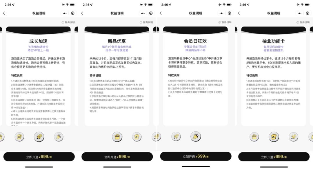 泡泡玛特的付费会员为699元/年,可享受新品优享、欧气加倍、成长加速、会员日狂欢4项权益,具体如下。