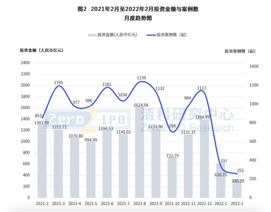 到了2月,仅发生255起投资案例,同比下降70.1%;其中披露金额案例221起,共涉及投资金额330.29亿人民币,同比下降74.6%。