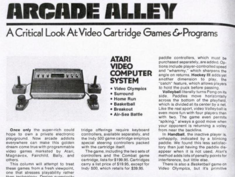 和其他大众消费品一样,游戏商业化不久,就有了与之相伴的推荐与评测。最早的电子游戏专栏可以追溯到1979年,当时美国杂志《Video》在刊物中开辟了“Arcade Alley”(直译为“街机巷”),用以介绍流行的游戏硬件和软件。