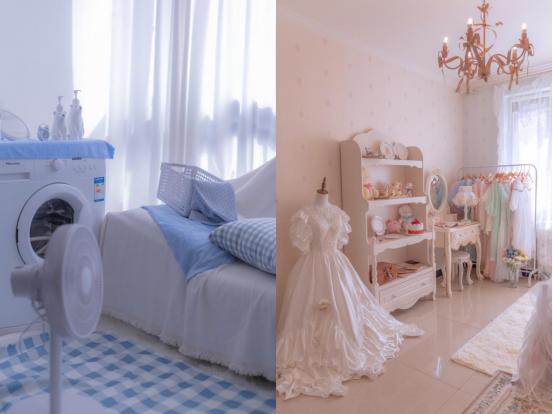 现在工作室的风格有蓝白居家、日系、少女、法式、复古、浴缸、生日、钢琴等等,还配了专门的化妆台和灯具。装修到三月底刚刚结束,前后一共花了两三万,不过当时没有管父母要,除了花自己的积蓄之外,还有个朋友过来投资了我一些,之后的摄影棚收益会给他分红。