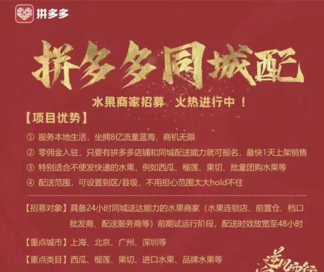 据北京商报报道,一张在业内流传的“拼多多同城配”招商截图内容显示,拼多多正在招募具备24小时同城送达能力的水果商家,例如水果连锁店、前置仓、档口批发商等,重点试水城市在北京、上海、广州、深圳等地。同时,由于项目处于前期试运行阶段,配送时效会放宽至48小时。