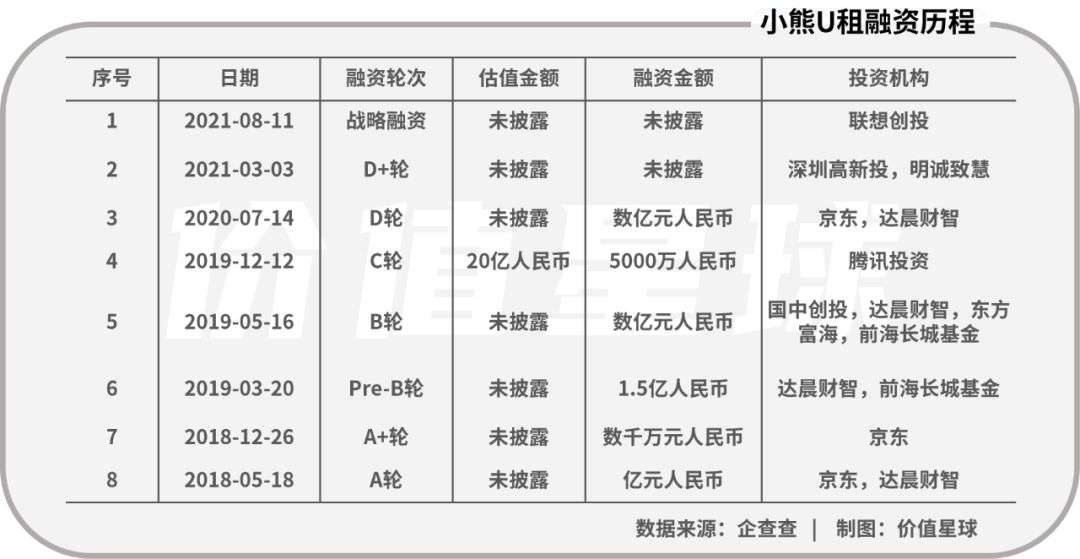 这三家投资机构的背后分别是腾讯、京东和联想,其中腾讯在2019年斥资5000万参与小熊U租C轮融资,京东则参与了A、A+、D轮三轮融资,联想最晚进入股东行列,具体投资金额未知。