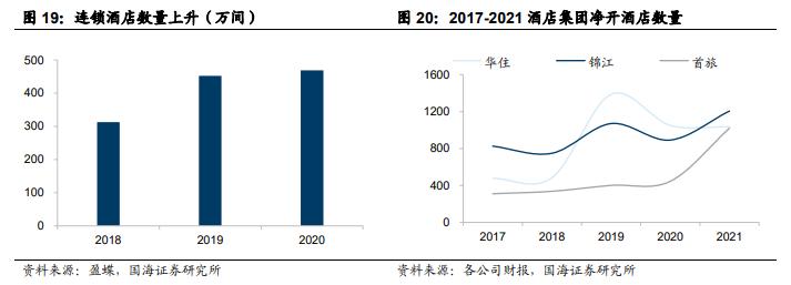 同时,疫情推动中小单体酒店加速出清,行业连锁化加速。三大酒店集团逆势拓店,通过加盟模式实现快速扩张,市场进一步向龙头集中。2021 年华住、锦江、首旅全年净开酒店1041/1207/1021 家,全年净开加盟店 1057/1220/1025 家。