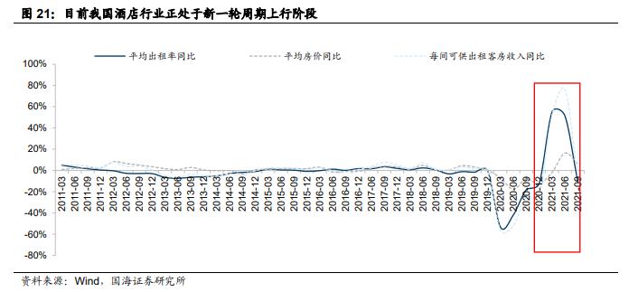 为缓解酒店行业的压力,2月以来国家部委及地方政府相继推出支持政策,为包含酒店业在内的服务行业纾困解难。自2018年Q4中美贸易冲突导致宏观经济下滑行业进入衰退期开始,2020年Q2达到11年以来最低点。到2020年Q4以后,全国星级酒店各项指标同比降幅大大缩短,开始复苏。2021年上半年,星级酒店各项经营指标转正,行业已经进入了上行周期。