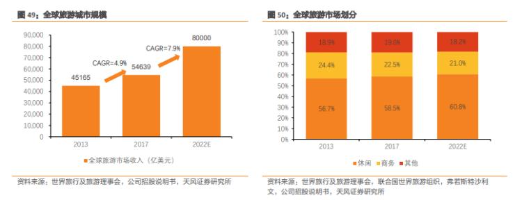 全球旅游市场稳步增长,2013-2017年的复合增长率为4.9%达5.5万亿美元,按照世界旅游机构预计,2017-2022年有望复合增长7.9%至8.0万亿美元。其中休闲旅游占比持续提升,有望从13年的56.7%提升至2022年的60.8%。
