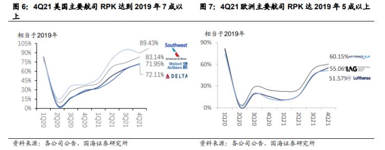事实上,截至2021年第四季度,美国四大航空公司:西南航空、美国航空、美联航、达美航空的RPK(衡量旅客运输量的综合性指标)已经恢复至2019年同期7成以上,欧洲三大航空集团客运量则超过2019年同期5成。