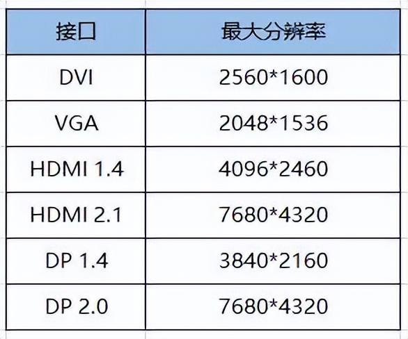 4种接口的所支持的最大分辨率都不同,从低到高的顺序可以依次排为VGA≤DVI≤HDMI≤DP。具体每个接口支持的最大分辨率为多少,大家可以参考下面这张图。