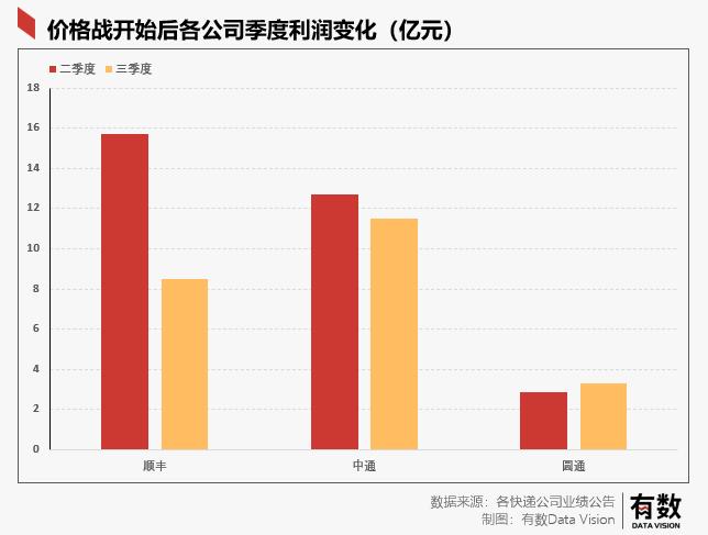 与之对应,二三季度顺丰的业绩就出现了较大的波动,净利润由15.7亿下滑至8.49亿,接近腰斩,直至四季度顺丰业绩才出现回暖。京东也是如此,第三季度一度亏损达7.27亿。而通达系利润几乎没有受到影响,圆通反而有所上涨。