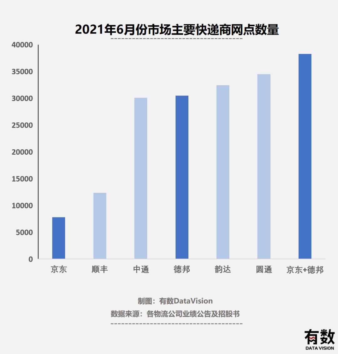 例如网点一直就是京东的短板之一,截止至2021年6月底,德邦快递网点数量共30468个,两者合并之后京东网点数量可能会直接问鼎市场第一,无人能敌。
