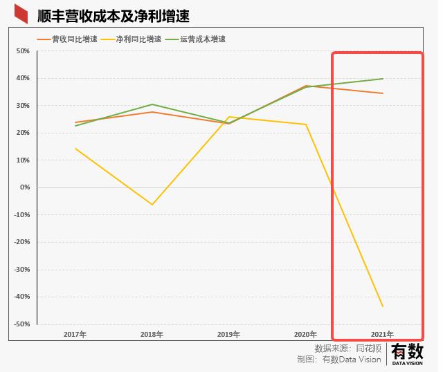 2021年,顺丰运营成本总体上升了41%,其中运力成本同比增幅达到71%,主要是顺丰为了满足订单数不得不增加直发干线与发车频次,还修建鄂州花湖机厂等一系列配套基础设施,总结下来,就是烧钱买运力。