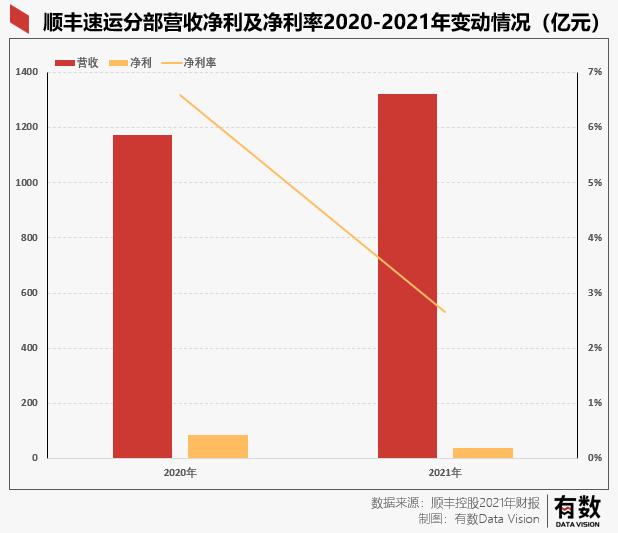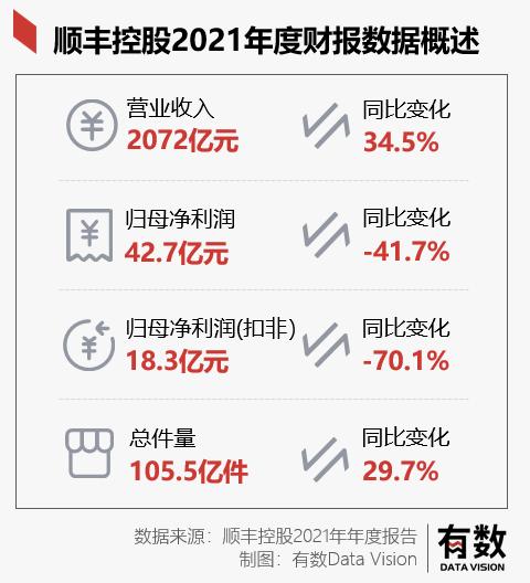 根据顺丰2021年年报显示,公司营收2072亿,同比上升34.5%;但归母净利润仅为42.7亿元,扣非之后的净利仅为18.3亿,同比下降70%多。其中,快递业务净利率1%多点,满脸都写着惨字。