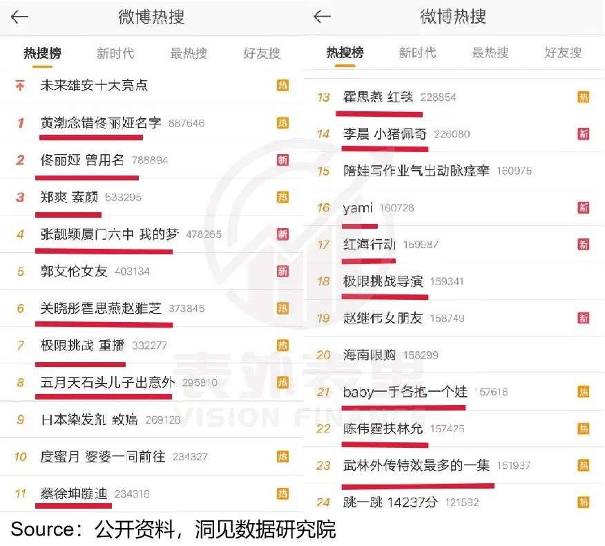 相关统计显示,那几年微博热搜表现出全娱乐趋势。如下图,2018年4月某天的热搜榜前20中,17条都是娱乐明星内容。
