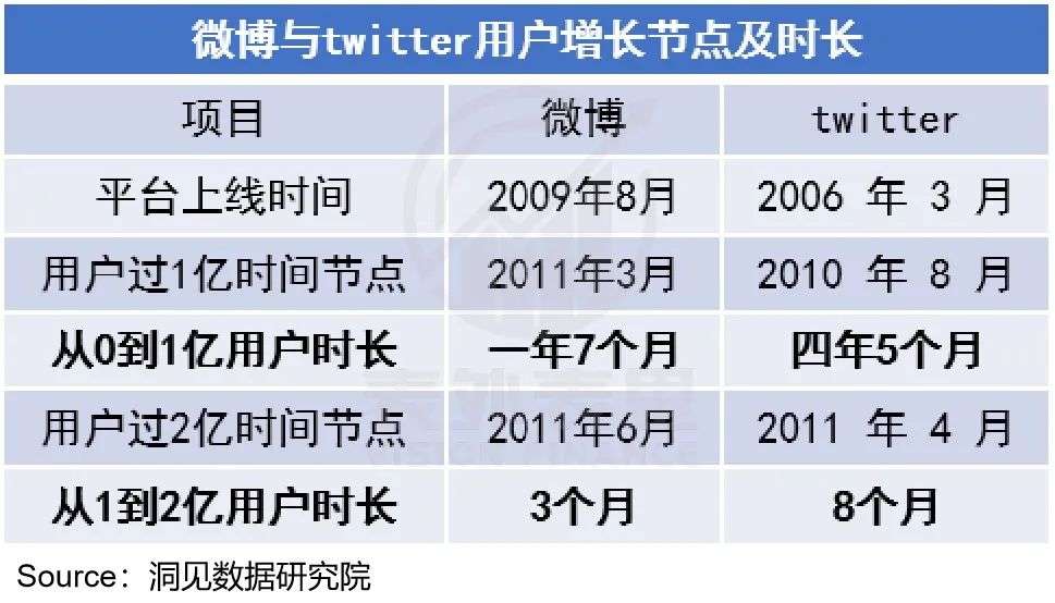 这在数据上也有一定印证。如下图,微博用一年半时间,用户即破亿。相比之下,Twitter四年时间,用户才攀升到亿级。