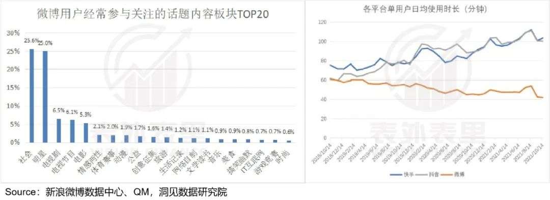 当然,微博并未“坐以待毙”,持续做内容扩充(相关论述很多,这里不做展开),但适配娱乐化内容的中心化分发方式,导致不管品类怎么变,平台大部分流量总是围着明星网红转。