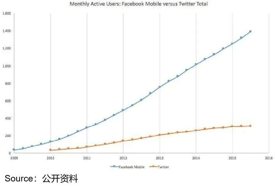 然而事实是,2010年之后,Twitter与Facebook的用户规模差距越来越大,2016年体量不及Facebook的五分之一。