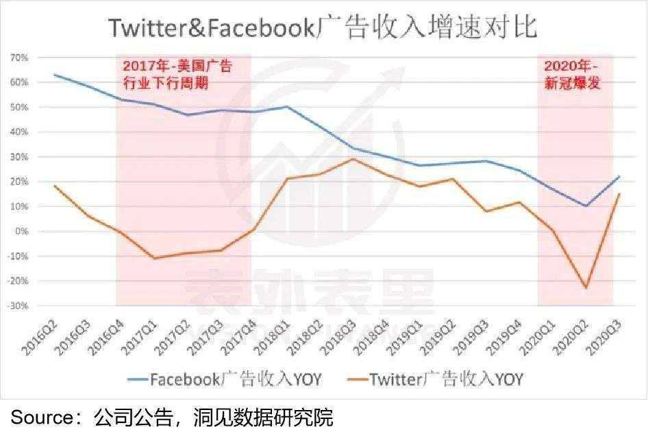而这样“一条腿走路”的风险在于:不抗周期。如下图,2017广告行业下行周期以及2020疫情黑天鹅下,大广告主紧缩预算,Twitter整体的收入弹性受到严重影响。