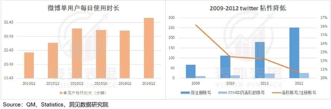 同时,前期用户粘性方面,2015Q1-2016Q2,微博用户时长稳健增长;反观Twitter,由于内容生态未成规模,2009-2012年用户粘性有所降低。