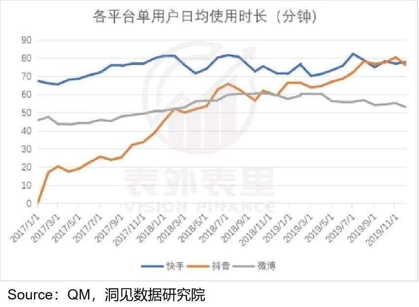 可以看到,从2018年开始,抖快的崛起已经威胁到微博的用户粘性:用户时长持续降低。