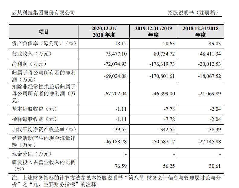 招股书显示,2018年2020年,云从科技研发费用分别是1.5亿元、4.5亿元、5.8亿元,占各期营收的比例分别是30.6%、56.3%和76.6%。