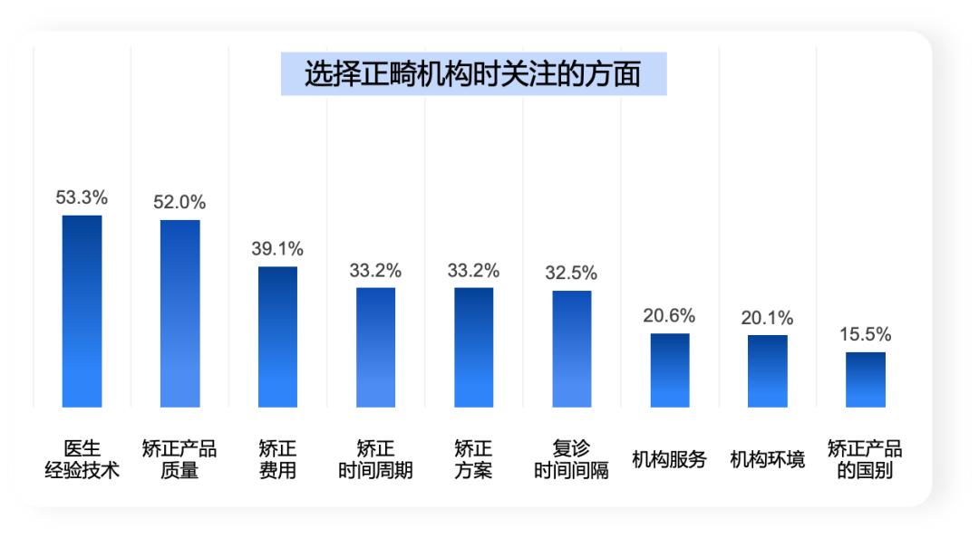 医生的经验高低以及产品质量的好坏往往决定了正畸的最终效果,超5成被访者关注的是医生经验技术和矫正产品的质量,可以看出作为一项“伪医美”项目,被访者最为在意是后续改善效果。