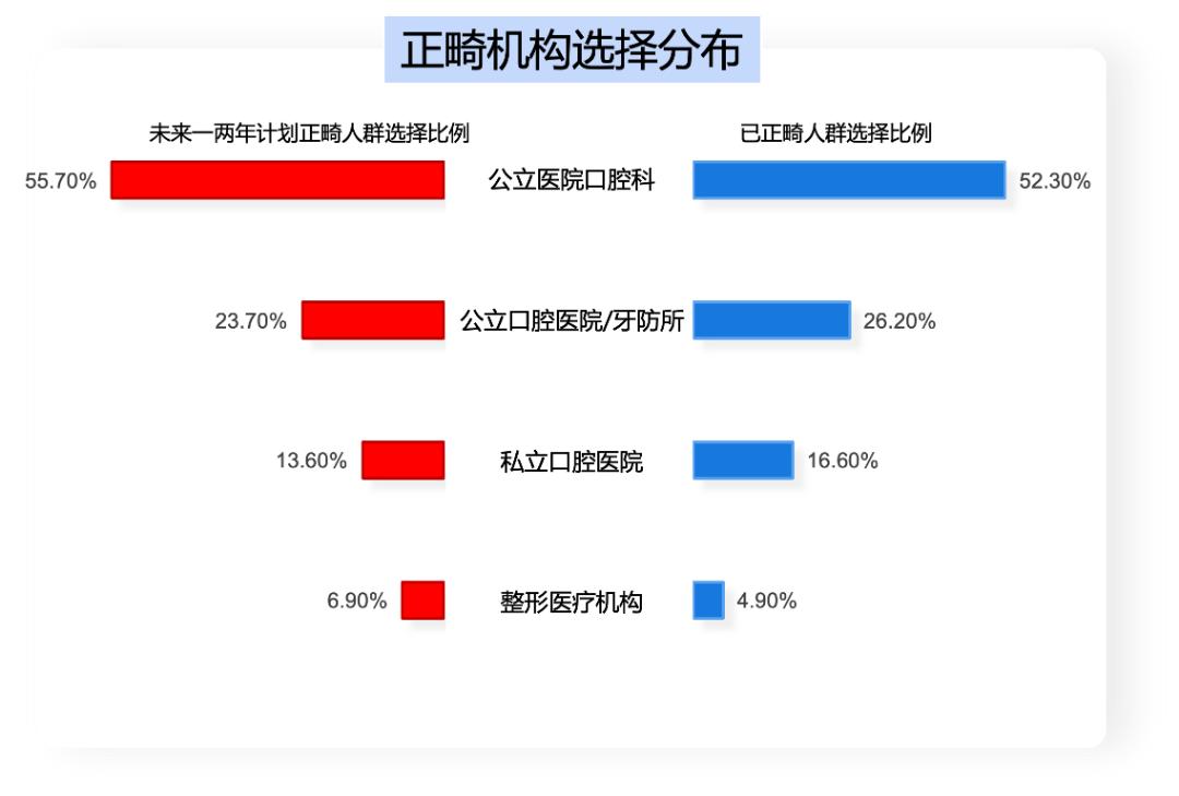 进行过牙齿正畸或计划正畸的被访者,超7成选择在公立机构进行牙齿正畸,其中5成左右选择公立医院;虽然正畸也被很多人看作是“变美”的一条路径,但仅有不到5%的被访者是在整形医疗机构做的正畸。