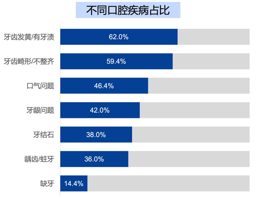 有62%的被访者认为自己的牙齿发黄不够白,同样有59.4%的被访者表示自己的牙齿不整齐。