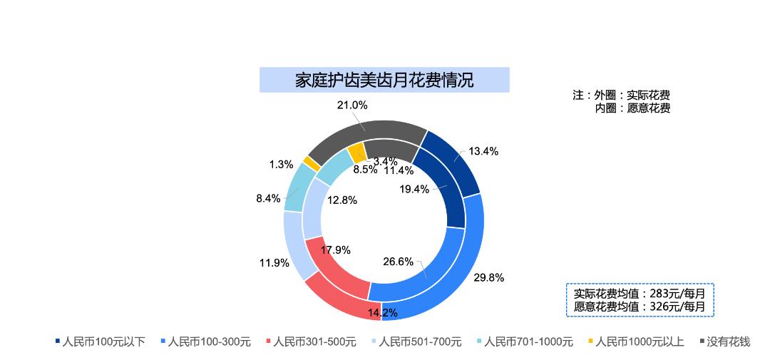 甚至有近10%的被访者表示愿意花费超过700元,家庭护齿市场目标用户消费力强劲。