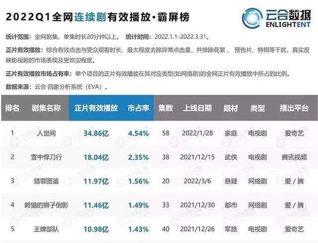 进入2022年,优酷这一尴尬局面仍看不到缓解希望。腾讯有爆款《开端》,爱奇艺有《人世间》——在云合数据统计中,今年第一季度有效播放前五剧集都出自腾讯视频、爱奇艺,无一来自优酷。