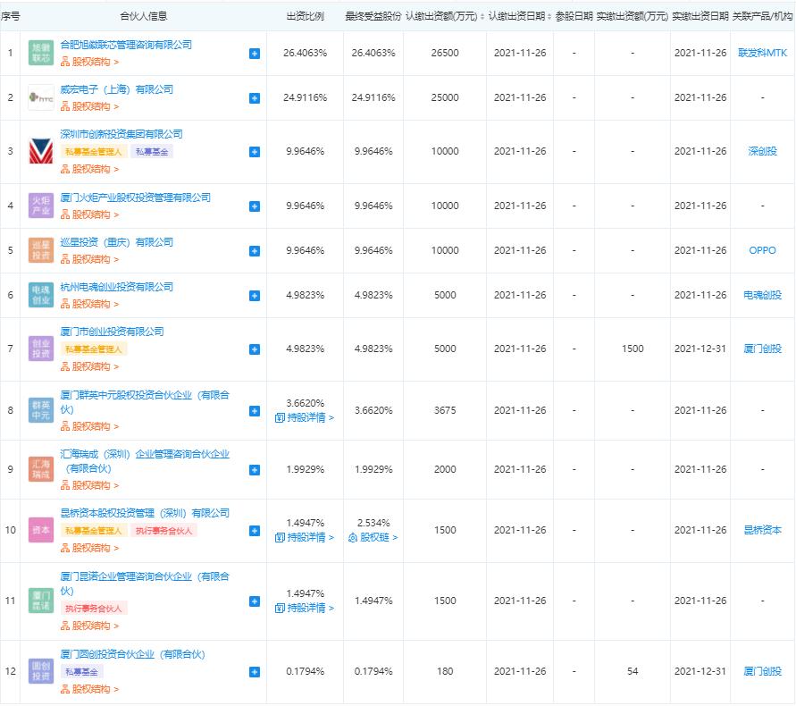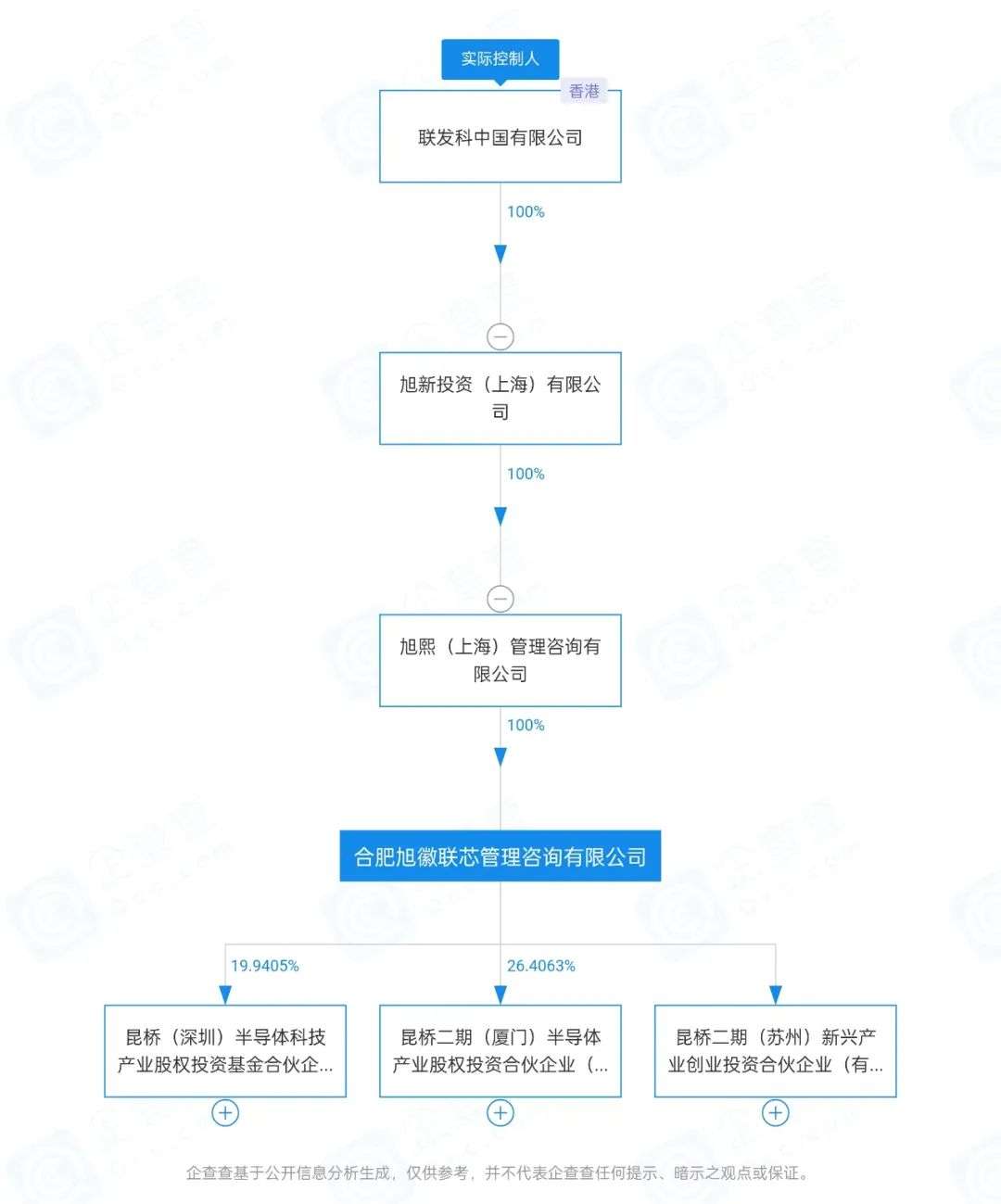 昆桥半导体投资的出资人有12家,其出资机构中合肥旭徽联芯管理咨询有限公司的实际控制人为联发科中国有限公司(MediaTek China Limited),后者由芯片设计巨头联发科(2454.TW)全资控股,其他几家分别与深创投、厦门创投和游戏、网络投资机构电魂创投相关。