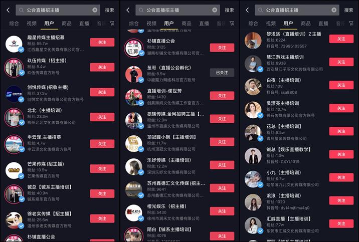 在抖音上搜索“公会主播招募”,可以找到大量类似苏江、崽崽这样账号昵称含有「主播培训」的蓝V账号。